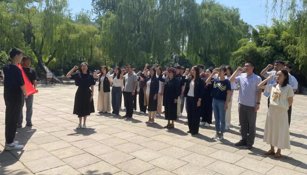 走出纪念馆,大家参观了中共山东省委机关旧址,在美铭广场瞻仰中共一大代表、济南共产党早期组织创始人王尽美、邓恩铭雕像。随后,学院党委组织员张志萍带领大家重温入党誓词,庄严宣誓。