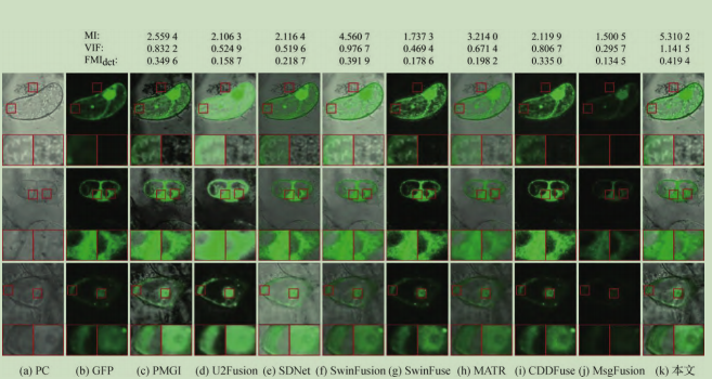 本文方法与其他8种方法在PC和GFP图像上的比较: